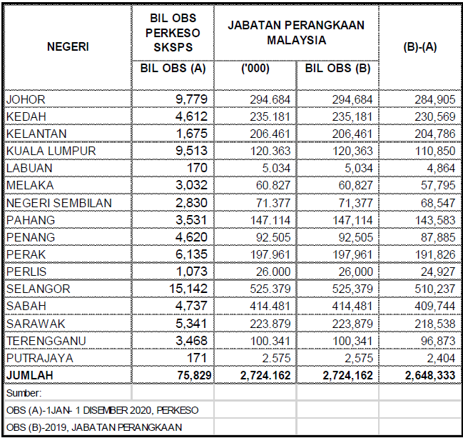 2. Statistik sehingga 1 Disember 2020 jumlah OBS yang mendaftar dan mencarum dengan PERKESO ialah seramai 75,829 orang sahaja iaitu 2.78% sahaja manakala baki 2.64juta orang atau 97.22% masih belum mencarum dan tiada perlindungan di bawah SKSPS.